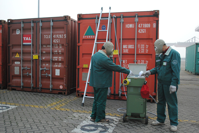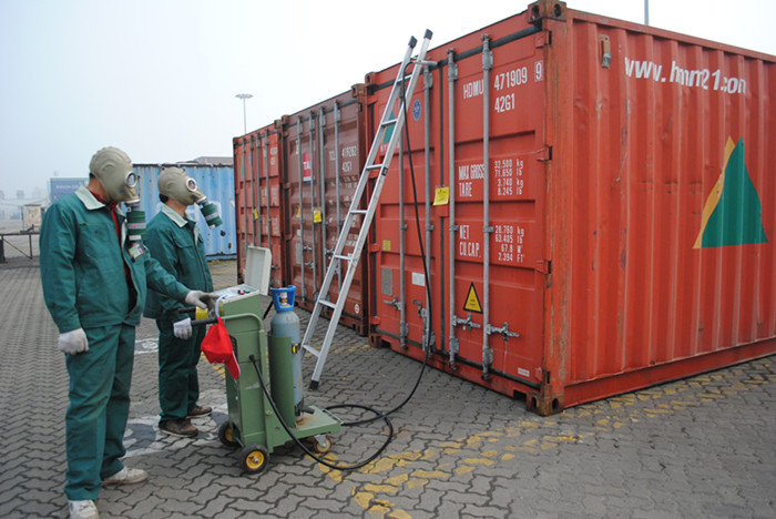 日前,中南地區(qū)第一臺(tái)最現(xiàn)代化的“移動(dòng)式微電腦施藥器”在長(zhǎng)沙新港投入使用。近日,湖南省進(jìn)出口檢驗(yàn)檢疫局技術(shù)人員,在長(zhǎng)沙新港首次對(duì)國(guó)際集裝箱采用封閉式消毒、熏蒸。這是我省使用的第一臺(tái)消毒熏蒸設(shè)備,結(jié)束商檢開(kāi)箱施藥消毒熏蒸的歷史。