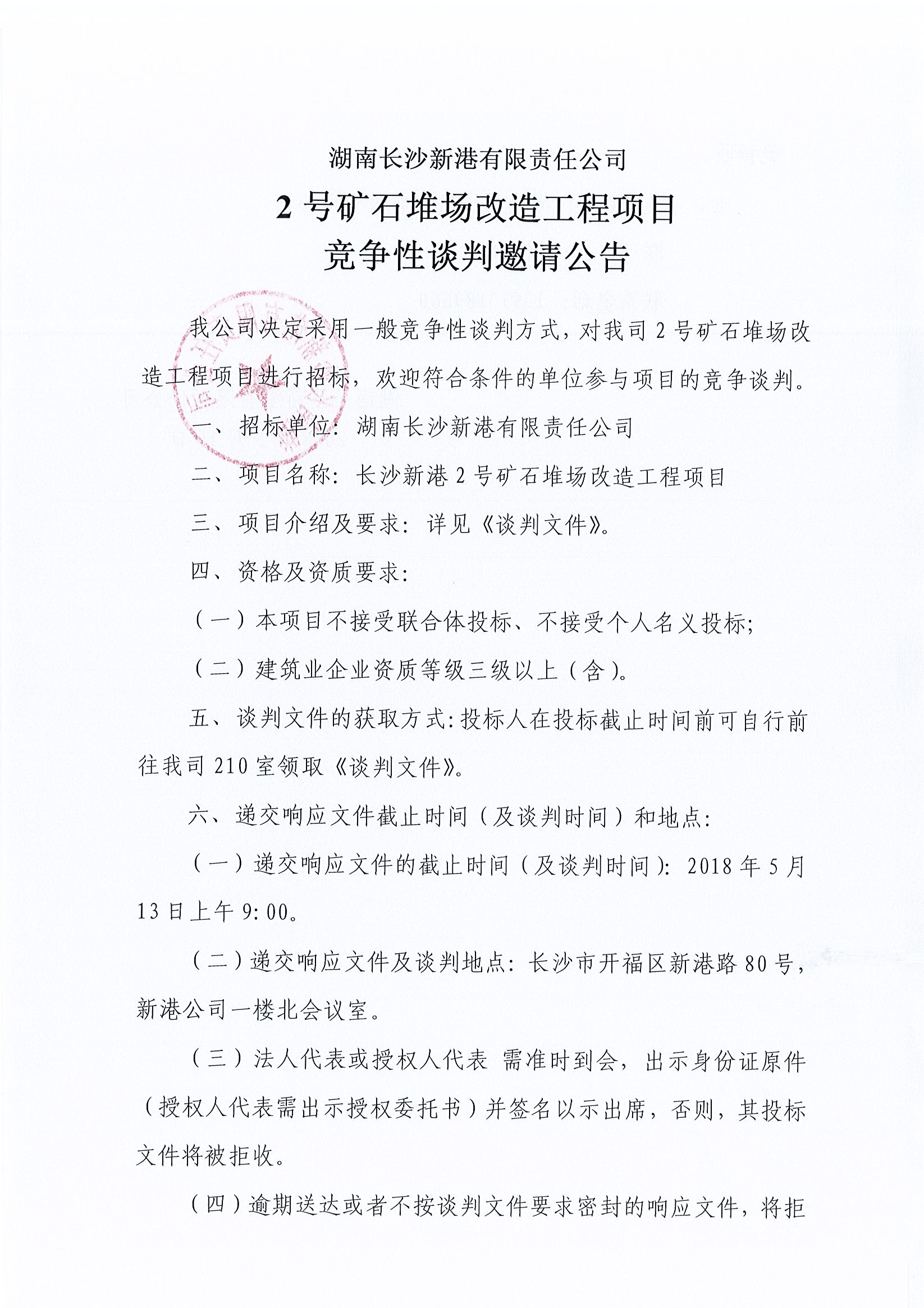 湖南長沙新港有限責(zé)任公司 2號礦石堆場改造工程項(xiàng)目競爭性談判邀請公告