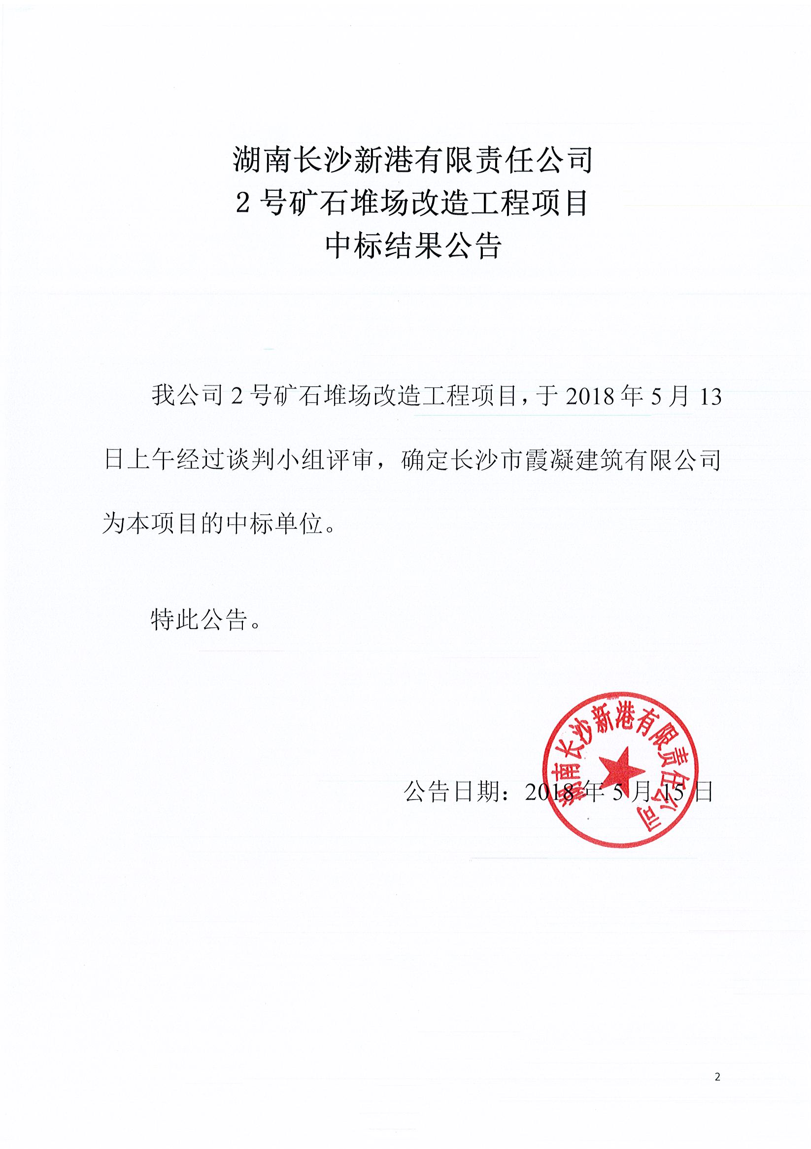 湖南長(zhǎng)沙新港有限責(zé)任公司 2號(hào)礦石堆場(chǎng)改造工程項(xiàng)目中標(biāo)結(jié)果公告