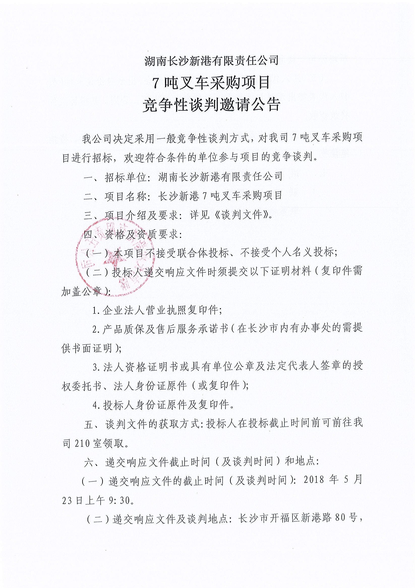 湖南長沙新港有限責任公司 7噸叉車采購項目競爭性談判邀請公告