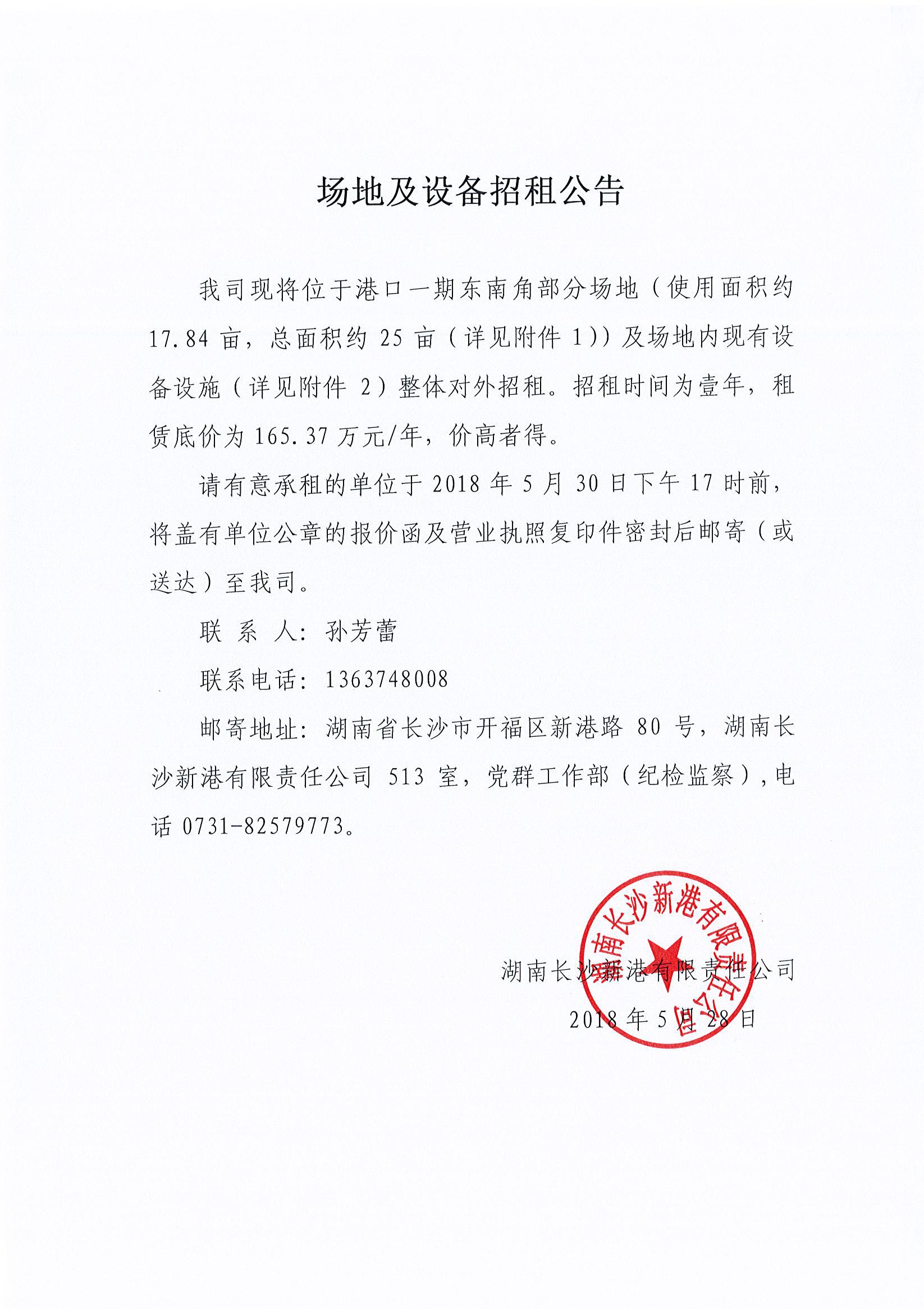 湖南長沙新港有限責任公司 場地及設(shè)備招租公告