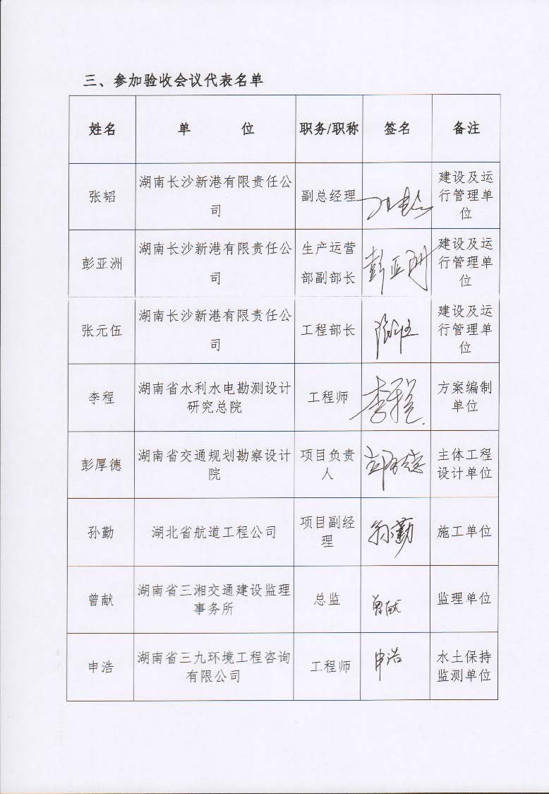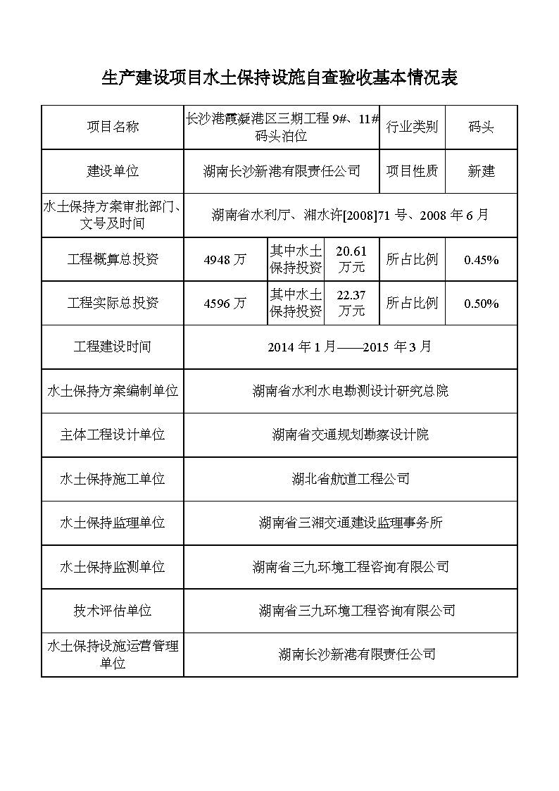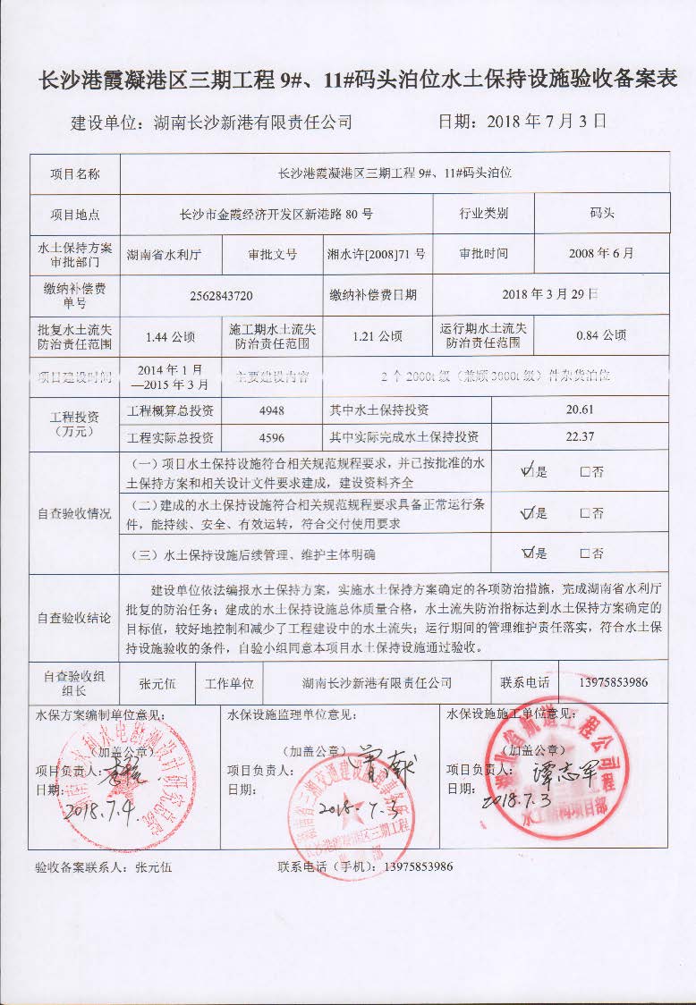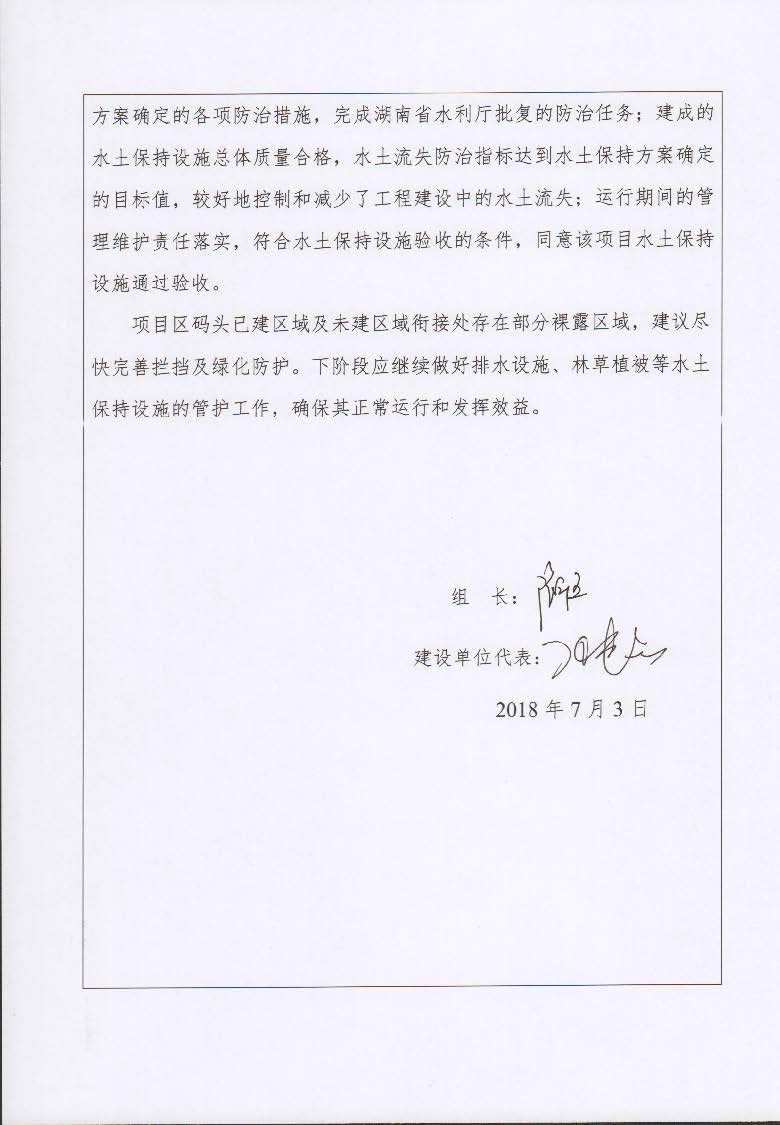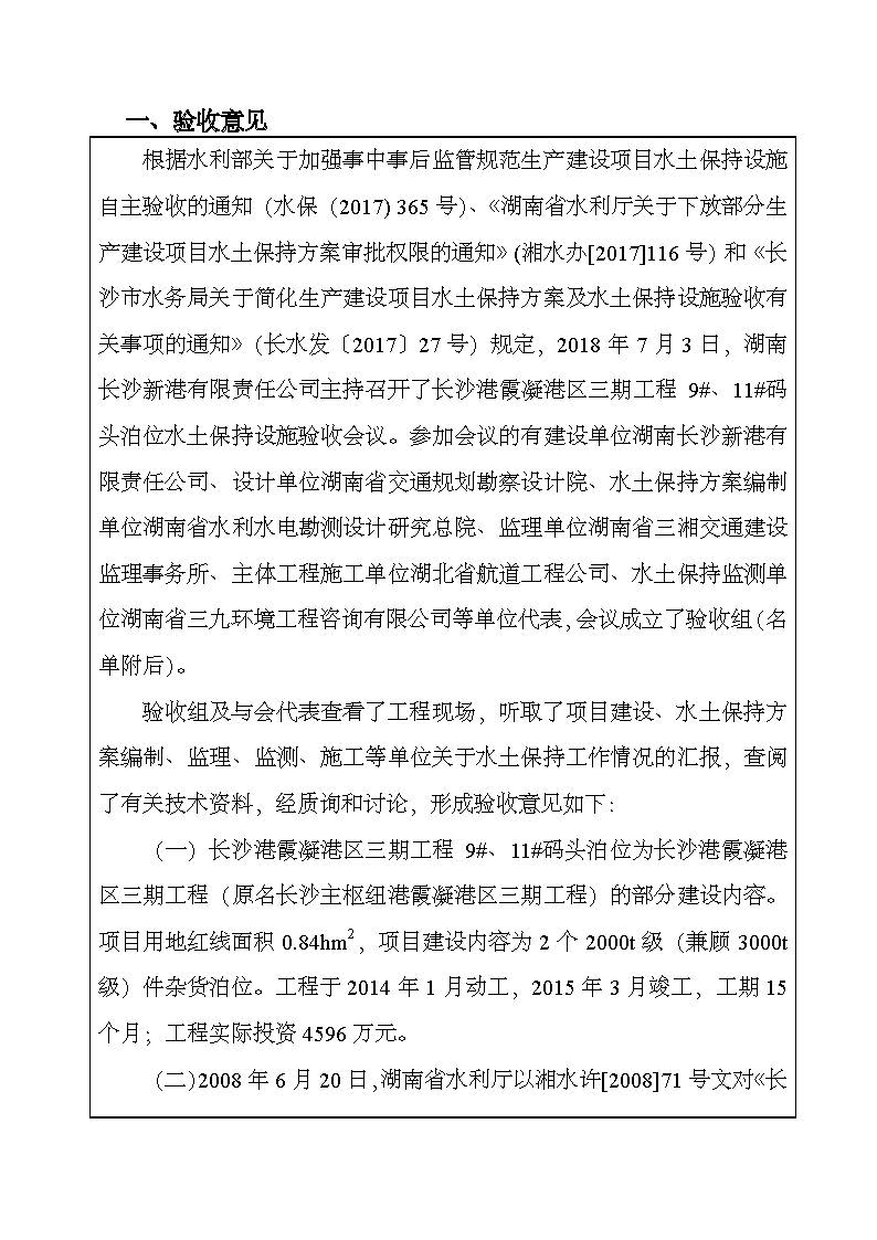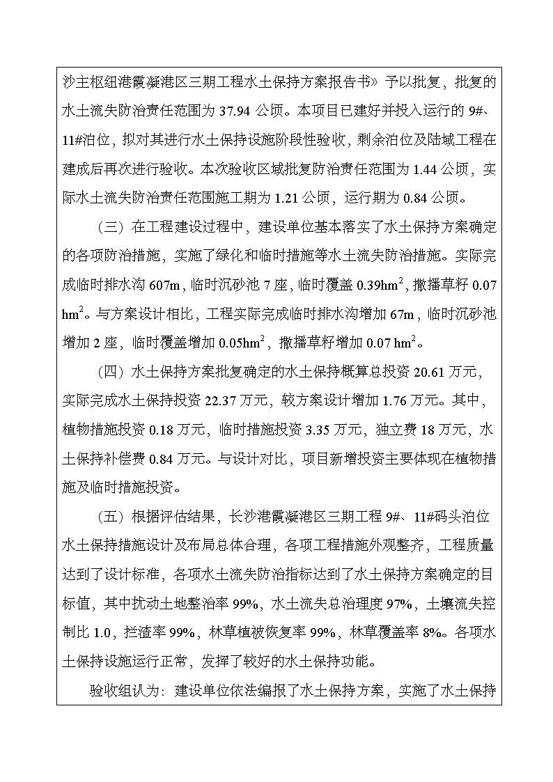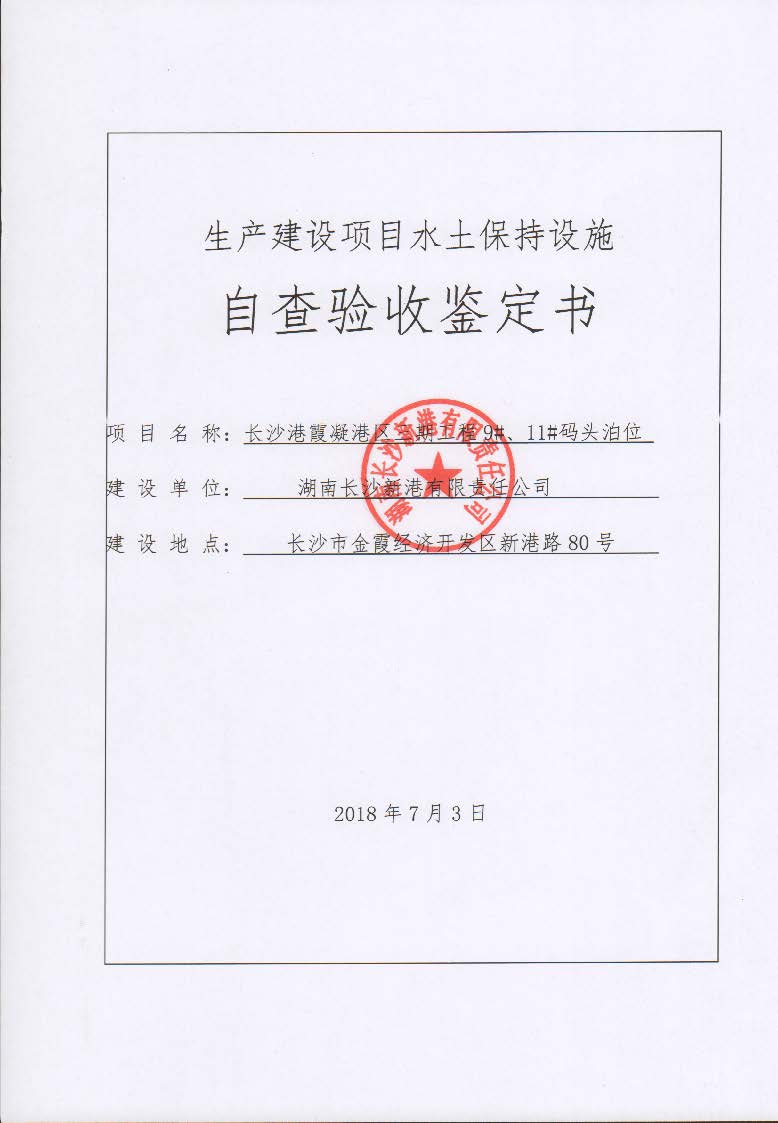 根據(jù)水利部關(guān)于加強(qiáng)事中事后監(jiān)管規(guī)范生產(chǎn)建設(shè)項目水土保持設(shè)施自主驗收的通知(水保(2017) 365號)、《湖南省水利廳關(guān)于下放部分生產(chǎn)建設(shè)項目水土保持方案審批權(quán)限的通知》(湘水辦[2017]116號)和《長沙市水務(wù)局關(guān)于簡化生產(chǎn)建設(shè)項目水土保持方案及水土保持設(shè)施驗收有關(guān)事項的通知》(長水發(fā)〔2017〕27號)規(guī)定,2018年7月3日,湖南長沙新港有限責(zé)任公司主持召開了長沙港霞凝港區(qū)三期工程9#、11#碼頭泊位水土保持設(shè)施驗收會議,會議成立了驗收組。 通過深入工程現(xiàn)場核查,并查閱相關(guān)檔案資料,驗收小組認(rèn)為本工程積極落實了各施工區(qū)域的水土流失防治工作,水土保持設(shè)施質(zhì)量總體合格,水土流失防治指標(biāo)達(dá)到了水土保持方案確定的目標(biāo)值,符合水土保持設(shè)施竣工驗收的條件。驗收組一致同意長沙港霞凝港區(qū)三期工程9#、11#碼頭泊位水土保持設(shè)施通過驗收。經(jīng)驗收組與會議審議,形成了《長沙港霞凝港區(qū)三期工程9#、11#碼頭泊位水土保持設(shè)施自查驗收鑒定書》。