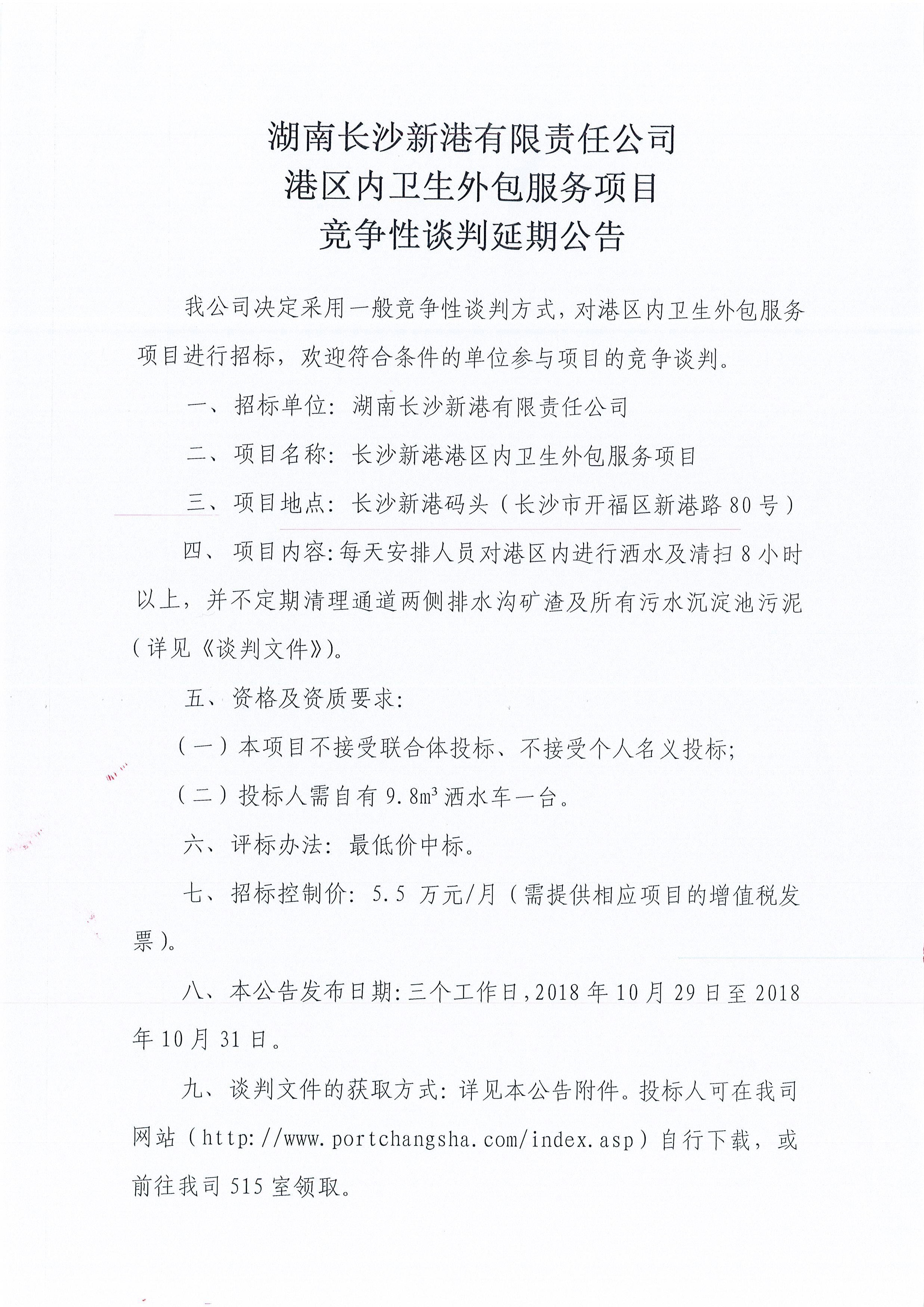 湖南長沙新港有限責(zé)任公司港區(qū)內(nèi)衛(wèi)生外包服務(wù)項(xiàng)目競爭性談判延期公告