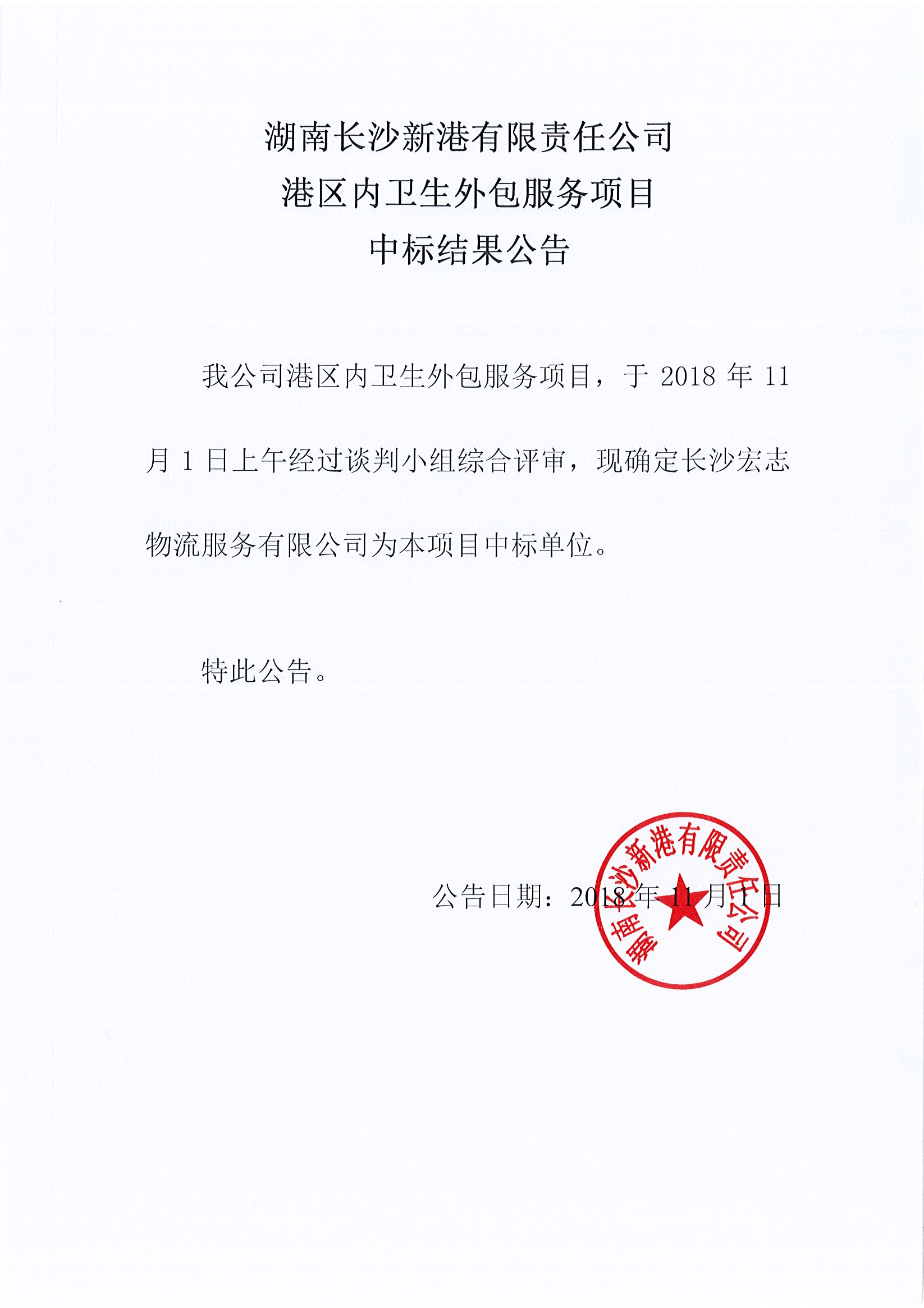 湖南長沙新港有限責(zé)任公司港區(qū)內(nèi)衛(wèi)生外包服務(wù)項(xiàng)目中標(biāo)結(jié)果公示