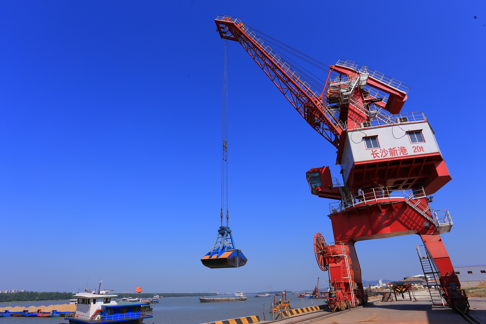 今日11時30分,室外溫度達(dá)到35℃,在長沙新港碼頭,門吊、岸吊的吊臂向江中延伸,在工作人員的操縱下加緊裝卸進(jìn)出港貨物。