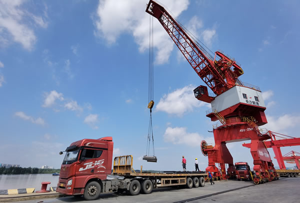近日,記者在長沙新港碼頭看到,碼頭泊位停滿貨船,起重機(jī)不停地將貨物從船上卸到拖車上,拖車在堆場與碼頭間川流不息。
