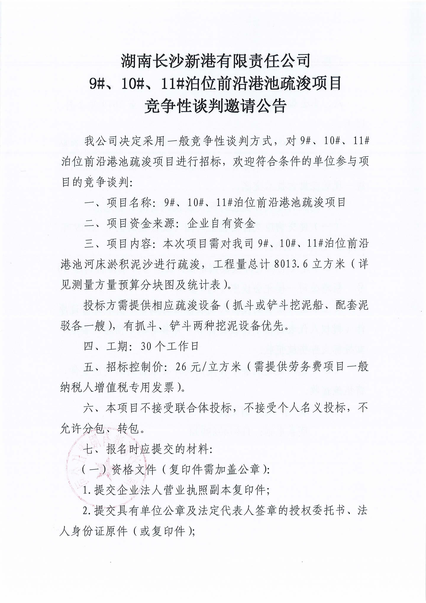 湖南長(zhǎng)沙新港有限責(zé)任公司 9#、10#、11#泊位前沿港池疏浚項(xiàng)目競(jìng)爭(zhēng)性談判邀請(qǐng)公告