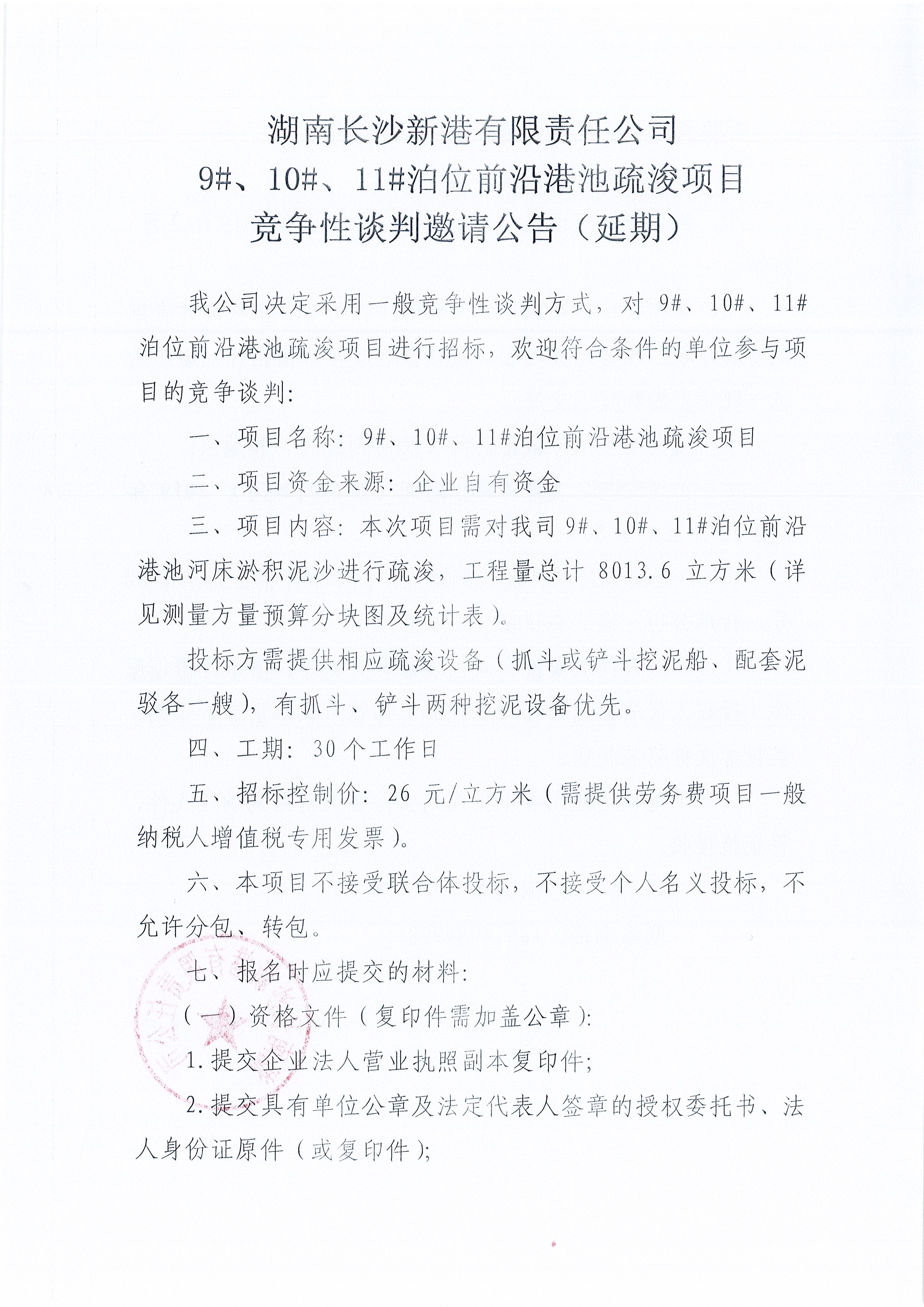 湖南長沙新港有限責(zé)任公司 9#、10#、11#泊位前沿港池疏浚項(xiàng)目競爭性談判邀請(qǐng)公告(延期)
