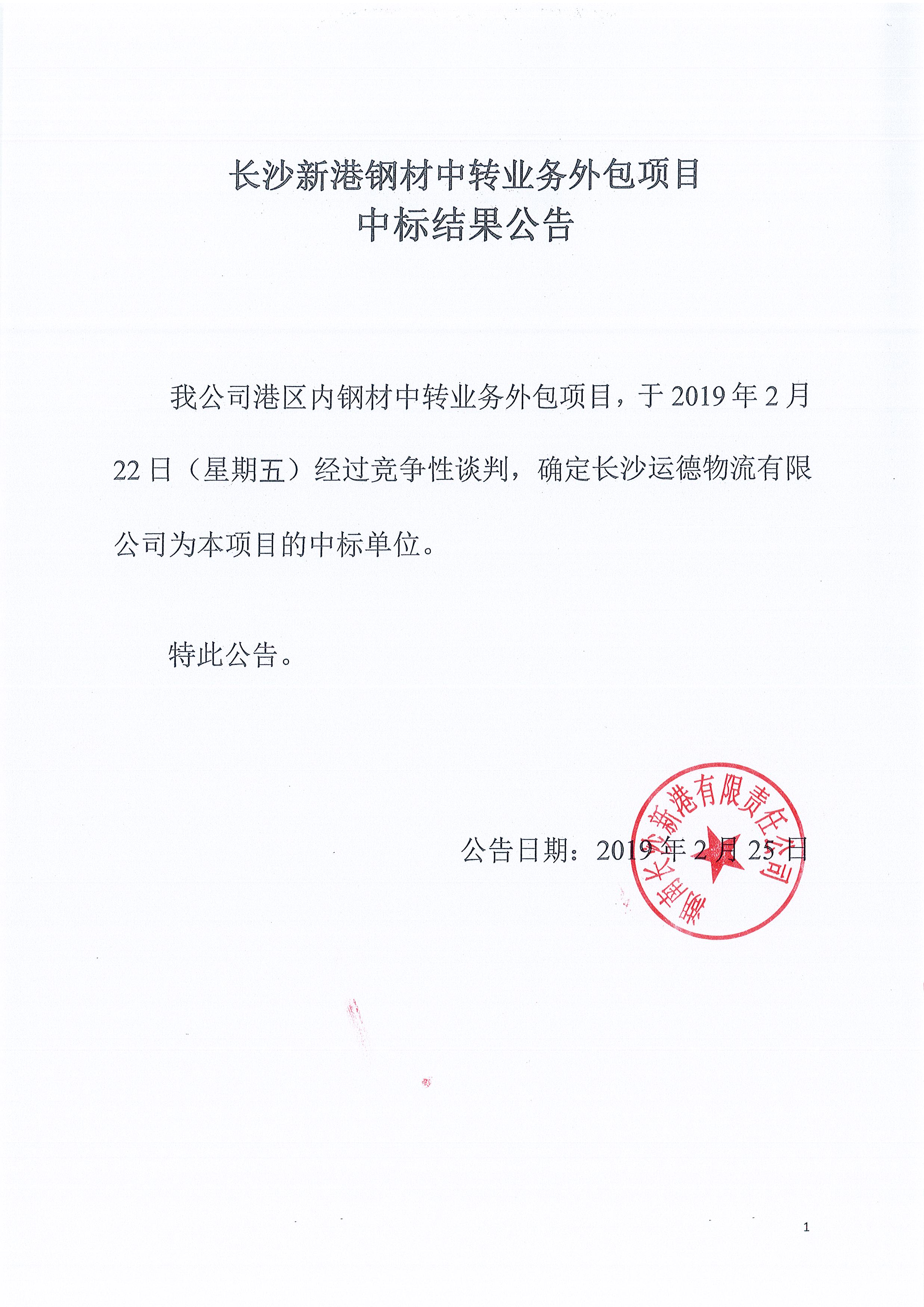 長沙新港鋼材中轉(zhuǎn)業(yè)務(wù)外包項(xiàng)目中標(biāo)結(jié)果公告