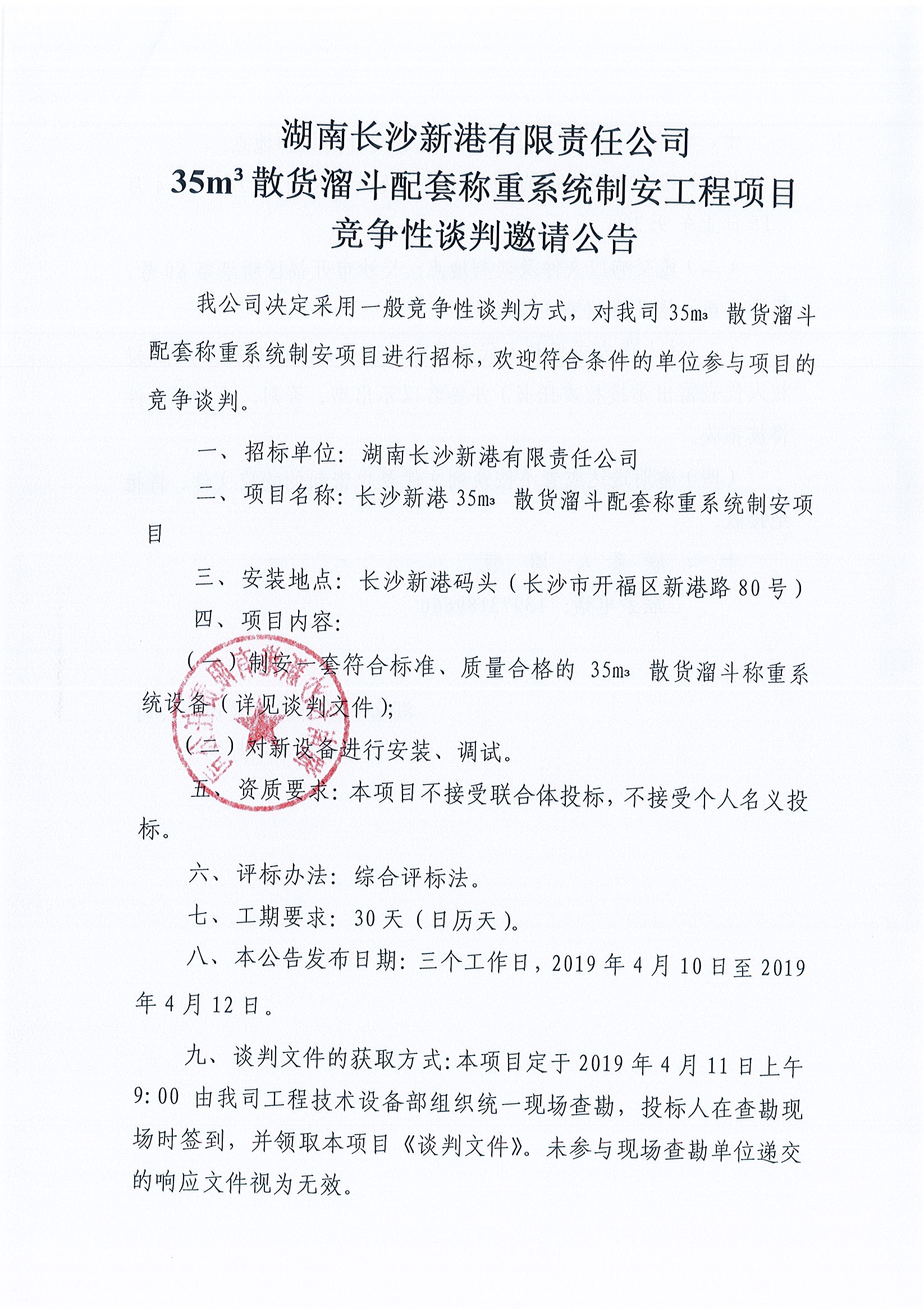 湖南長(zhǎng)沙新港有限責(zé)任公司35m³散貨溜斗配套稱重系統(tǒng)制安工程項(xiàng)目競(jìng)爭(zhēng)性談判邀請(qǐng)公告