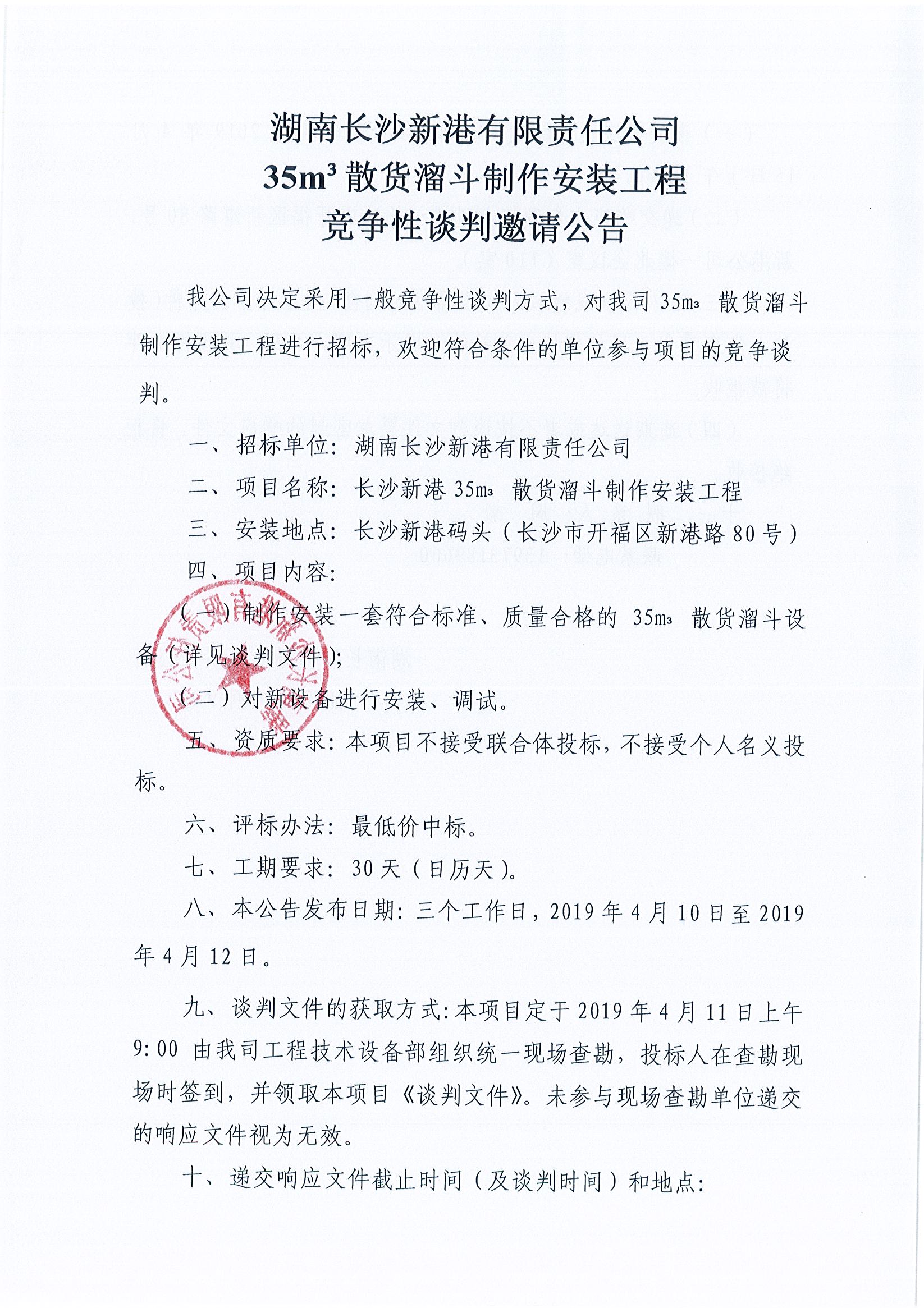 湖南長沙新港有限責任公司35m³散貨溜斗制作安裝工程競爭性談判邀請公告