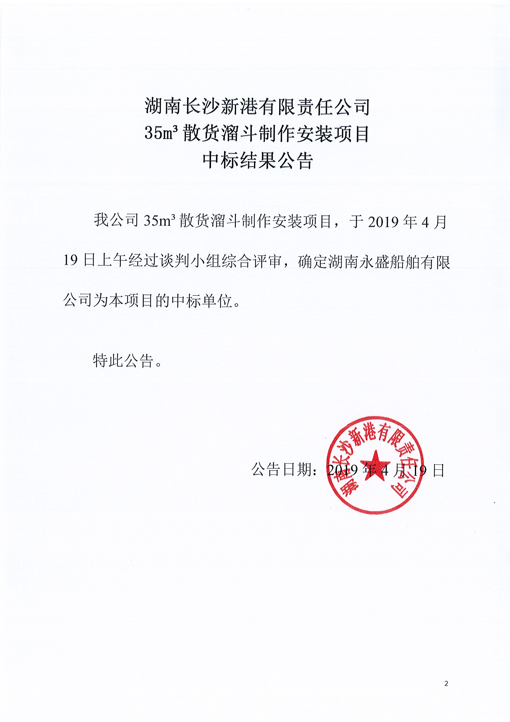 湖南長沙新港有限責任公司35m³散貨溜斗制作安裝項目中標結(jié)果公告