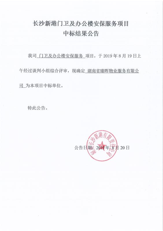 長沙新港門衛(wèi)及辦公樓安保服務項目中標結果公告