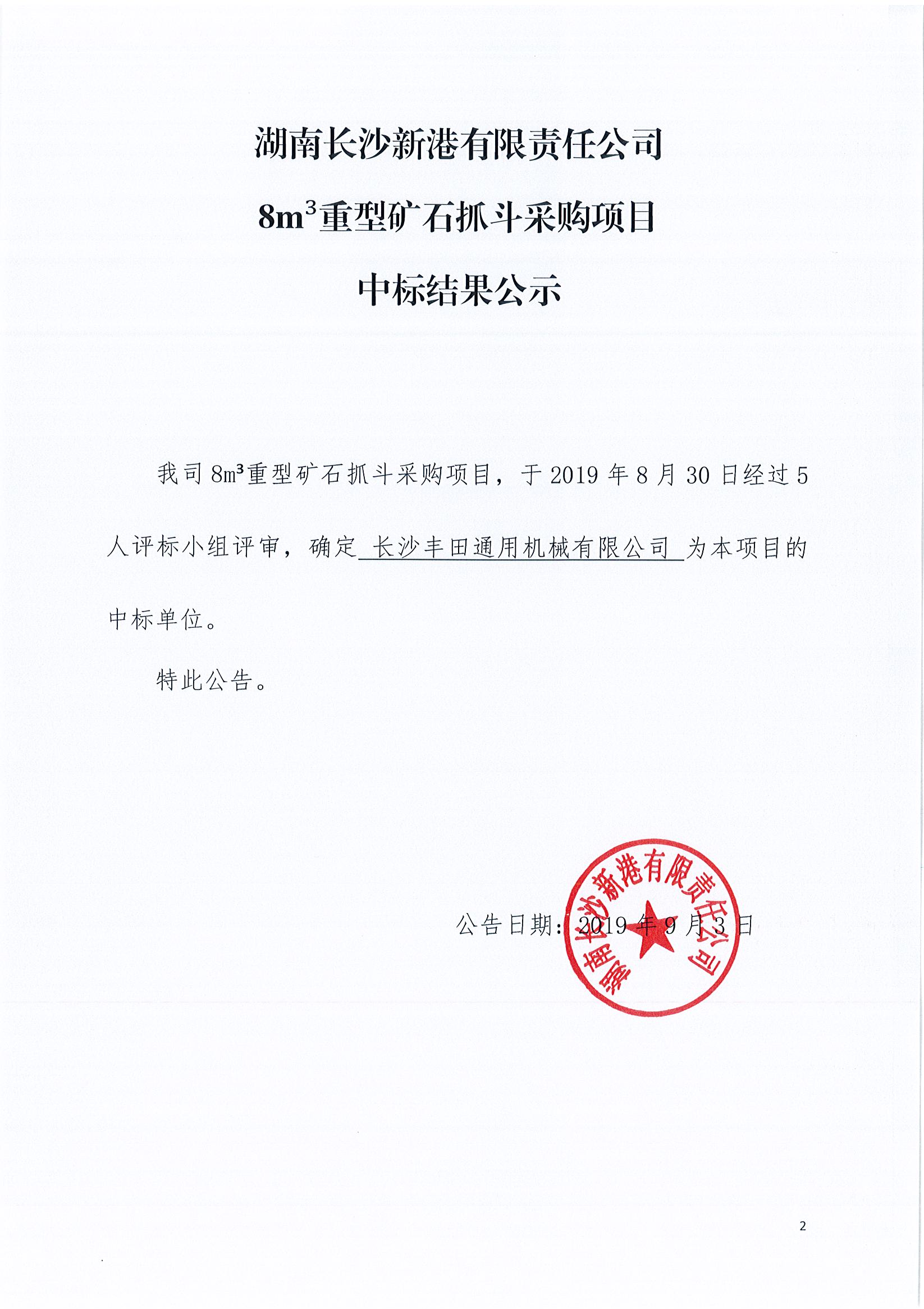 湖南長沙新港有限責(zé)任公司8m³重型礦石抓斗采購項目中標結(jié)果公示