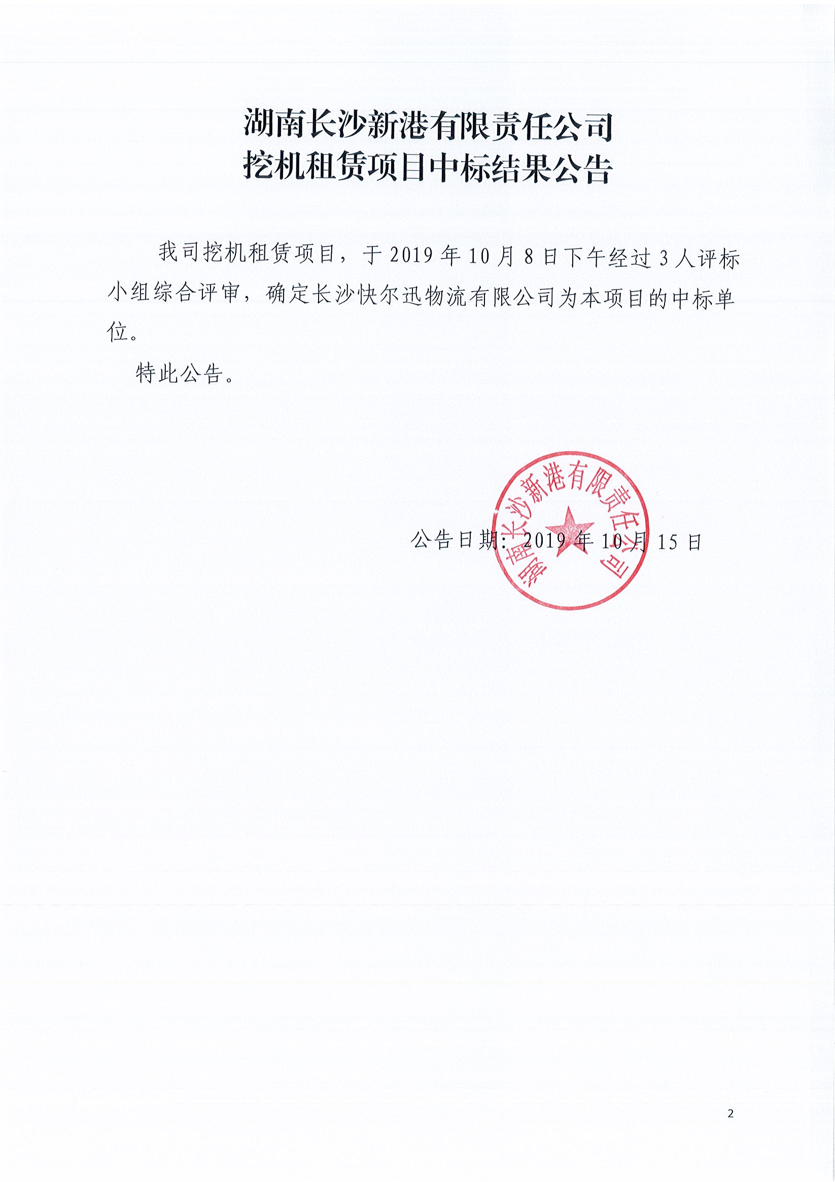 湖南長沙新港有限責(zé)任公司挖機租賃項目中標結(jié)果公告