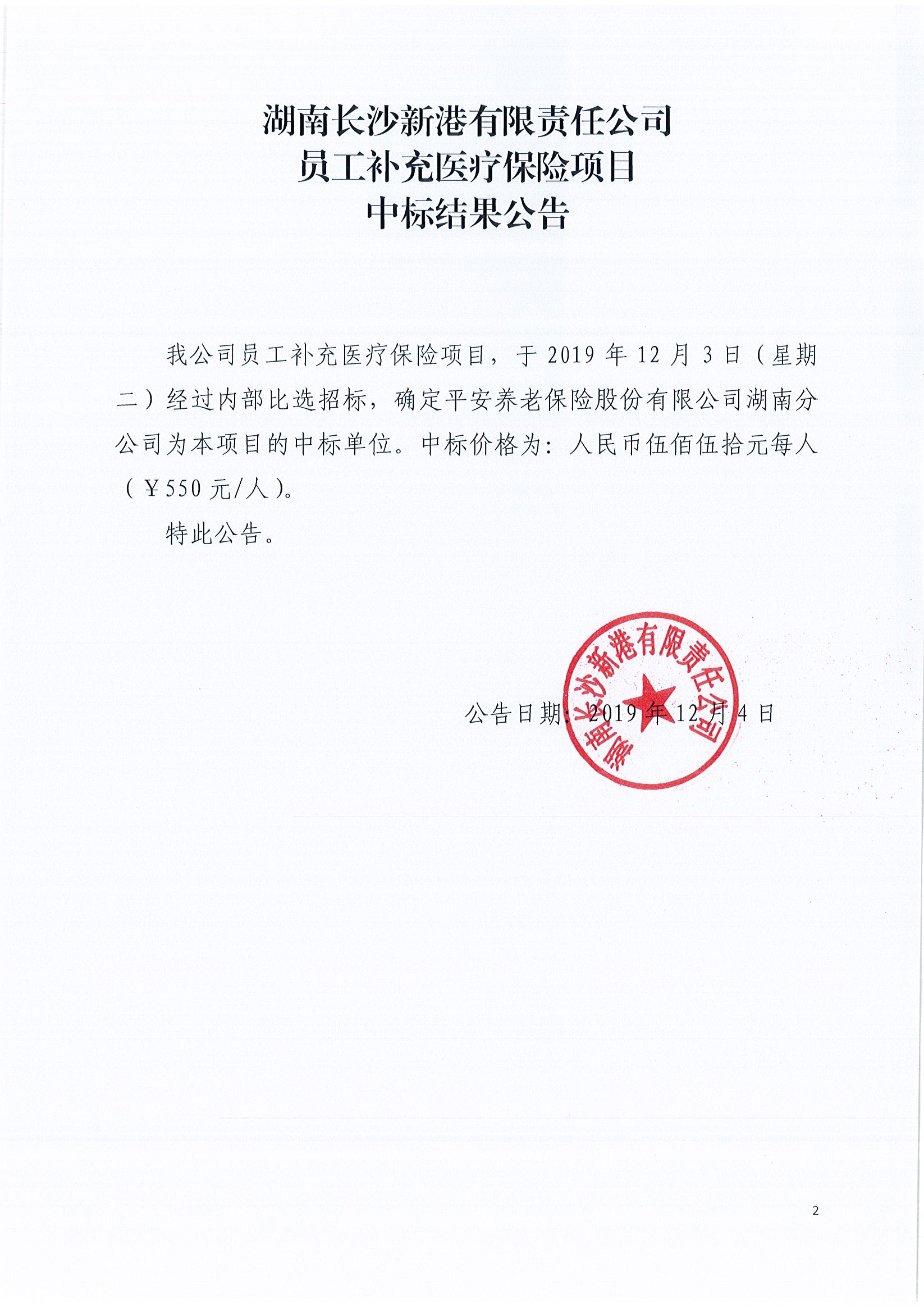 湖南長(zhǎng)沙新港有限責(zé)任公司員工補(bǔ)充醫(yī)療保險(xiǎn)項(xiàng)目中標(biāo)結(jié)果公告