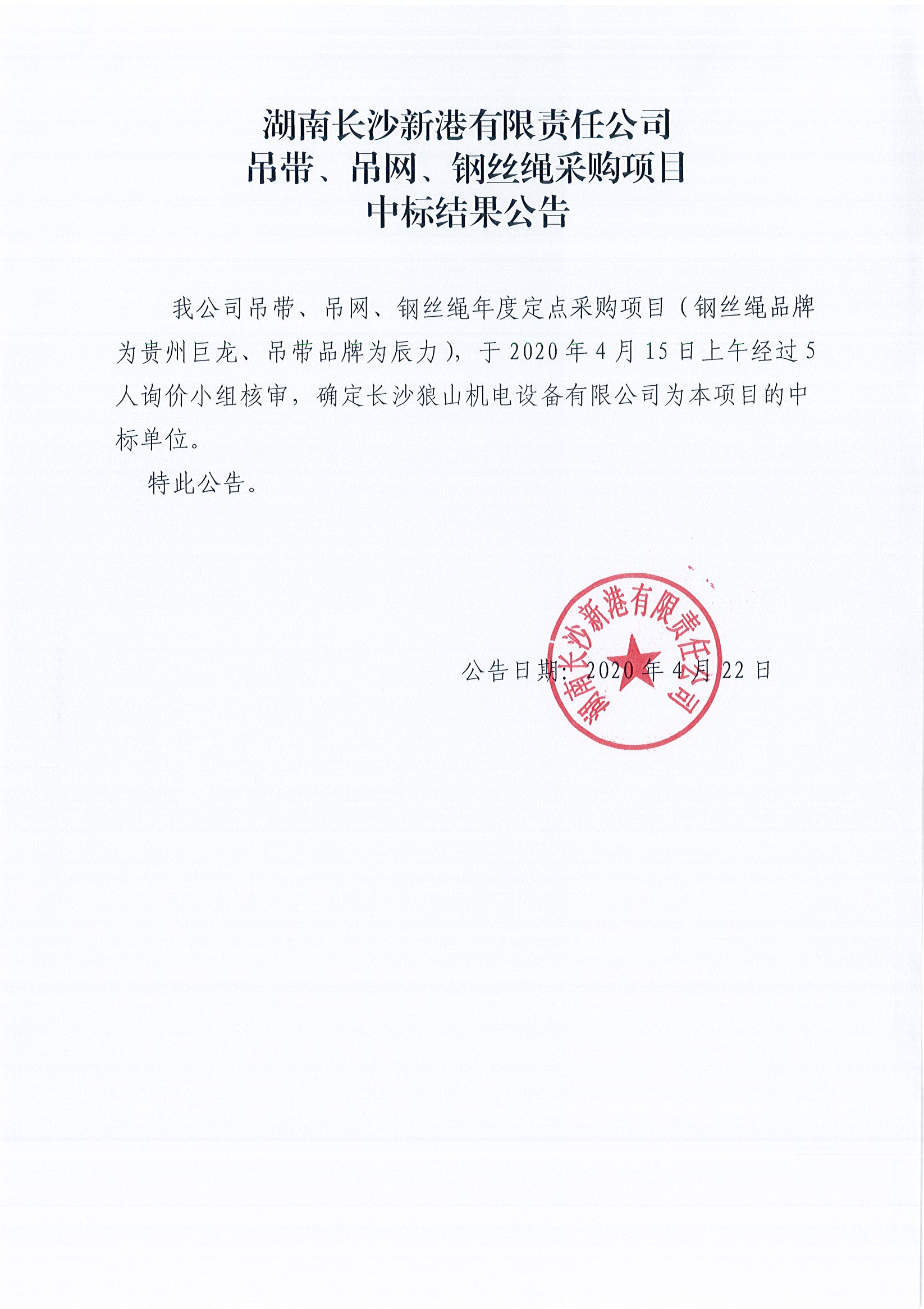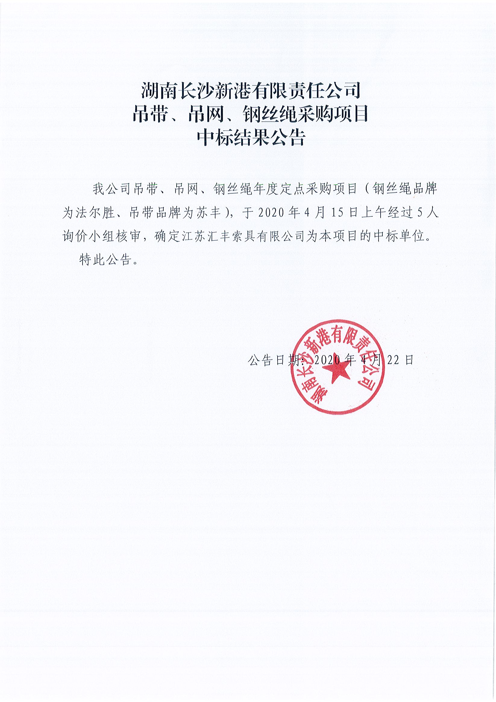 湖南長(zhǎng)沙新港有限責(zé)任公司吊帶、吊網(wǎng)、鋼絲繩采購(gòu)項(xiàng)目中標(biāo)結(jié)果公告