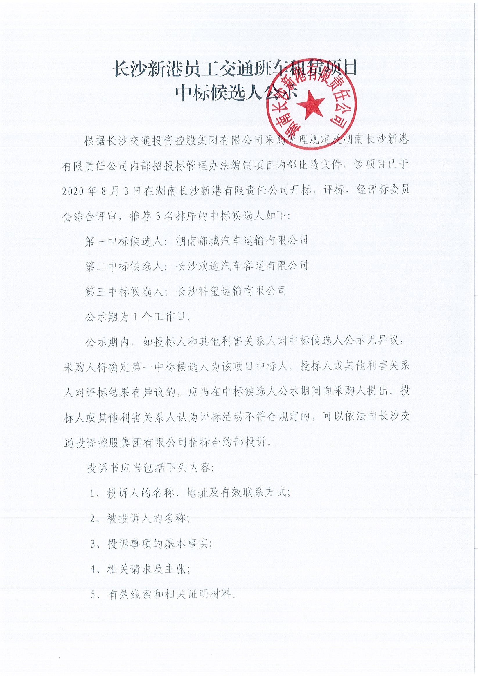 長(zhǎng)沙新港員工交通班車租賃項(xiàng)目中標(biāo)候選人公示