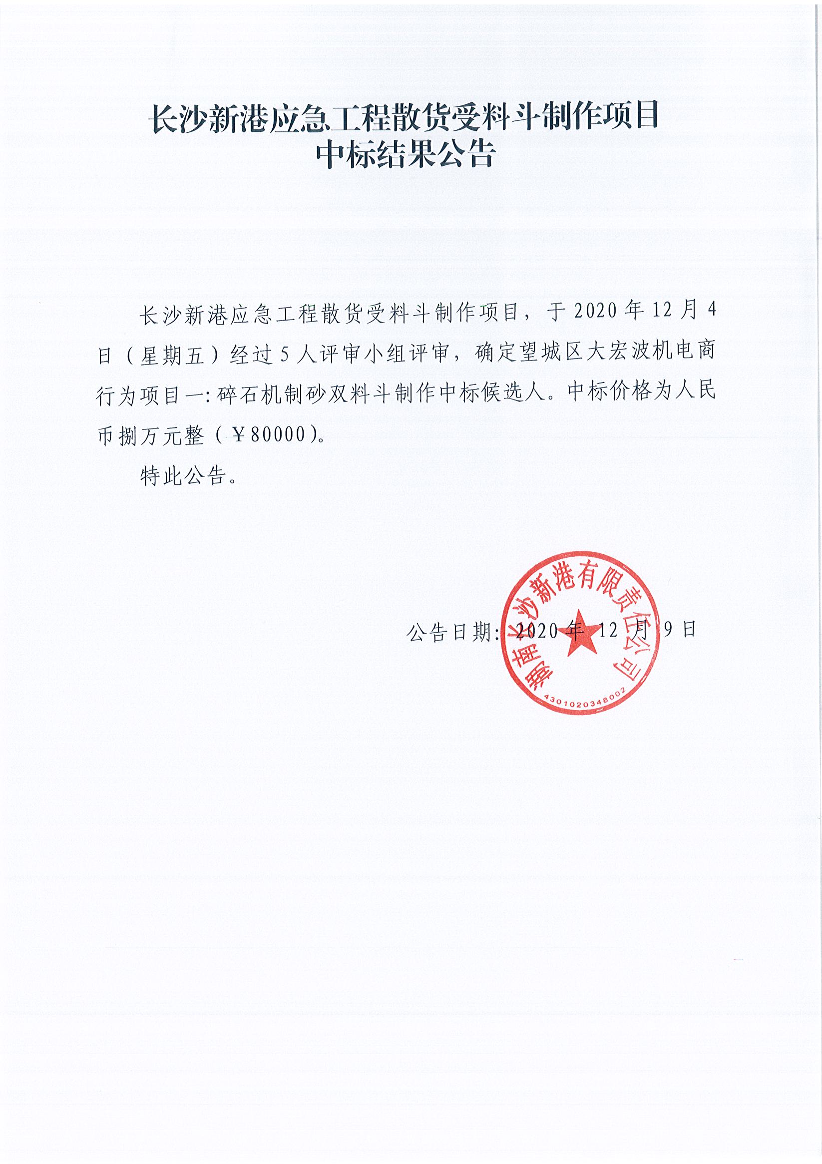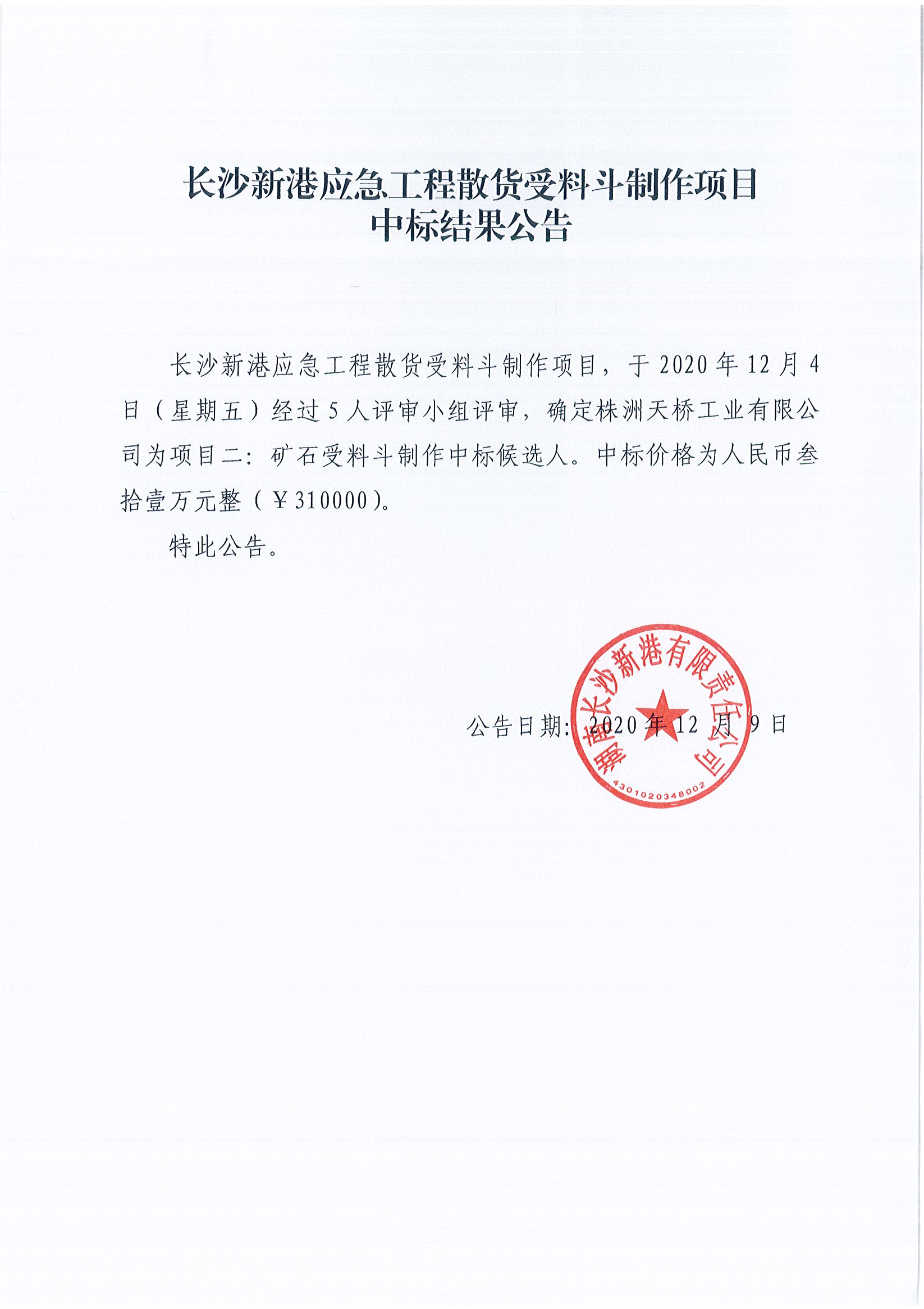 長沙新港應(yīng)急工程散貨受料斗制作項目中標(biāo)結(jié)果公告