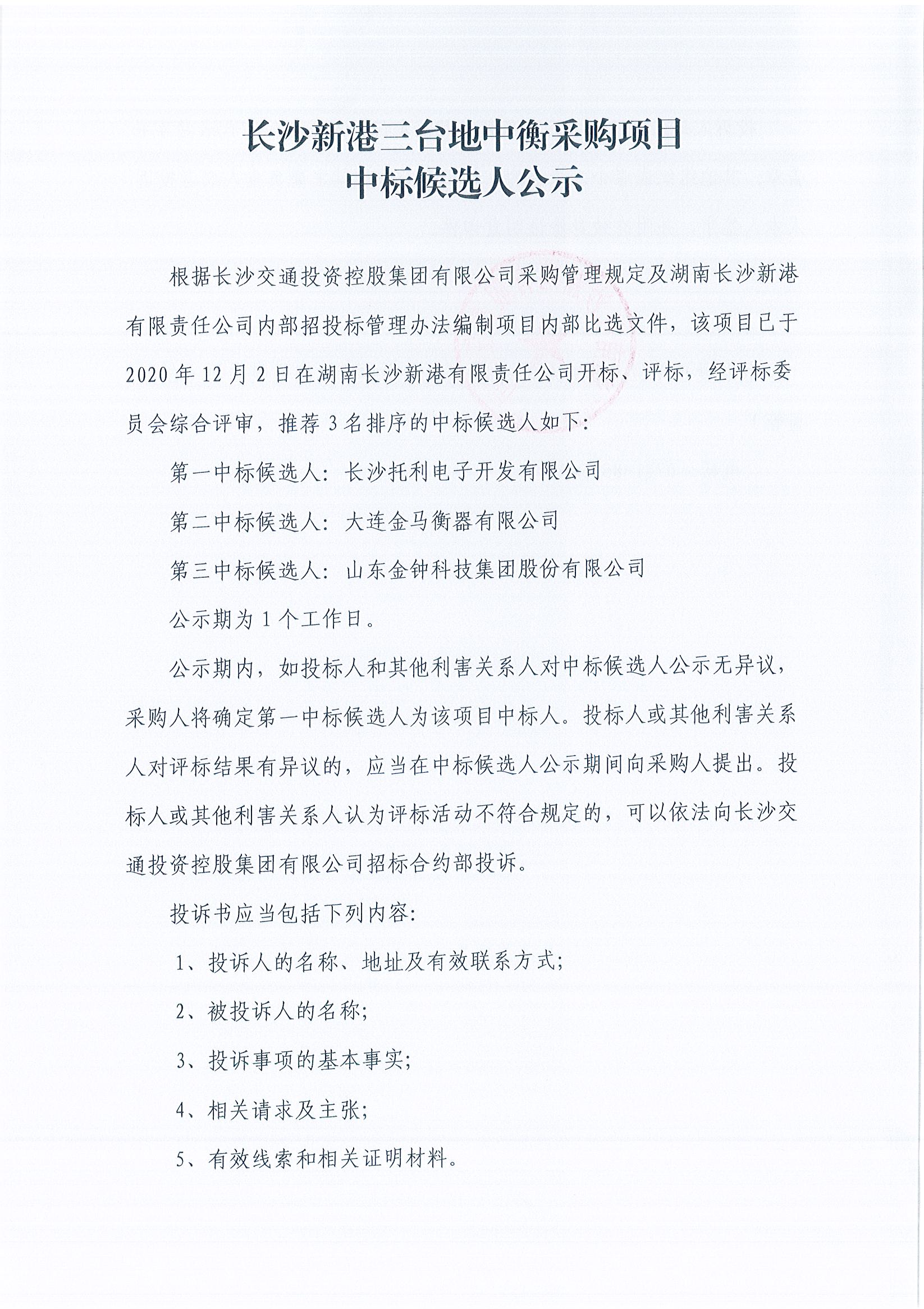 長沙新港三臺地中衡采購項目中標(biāo)候選人公示