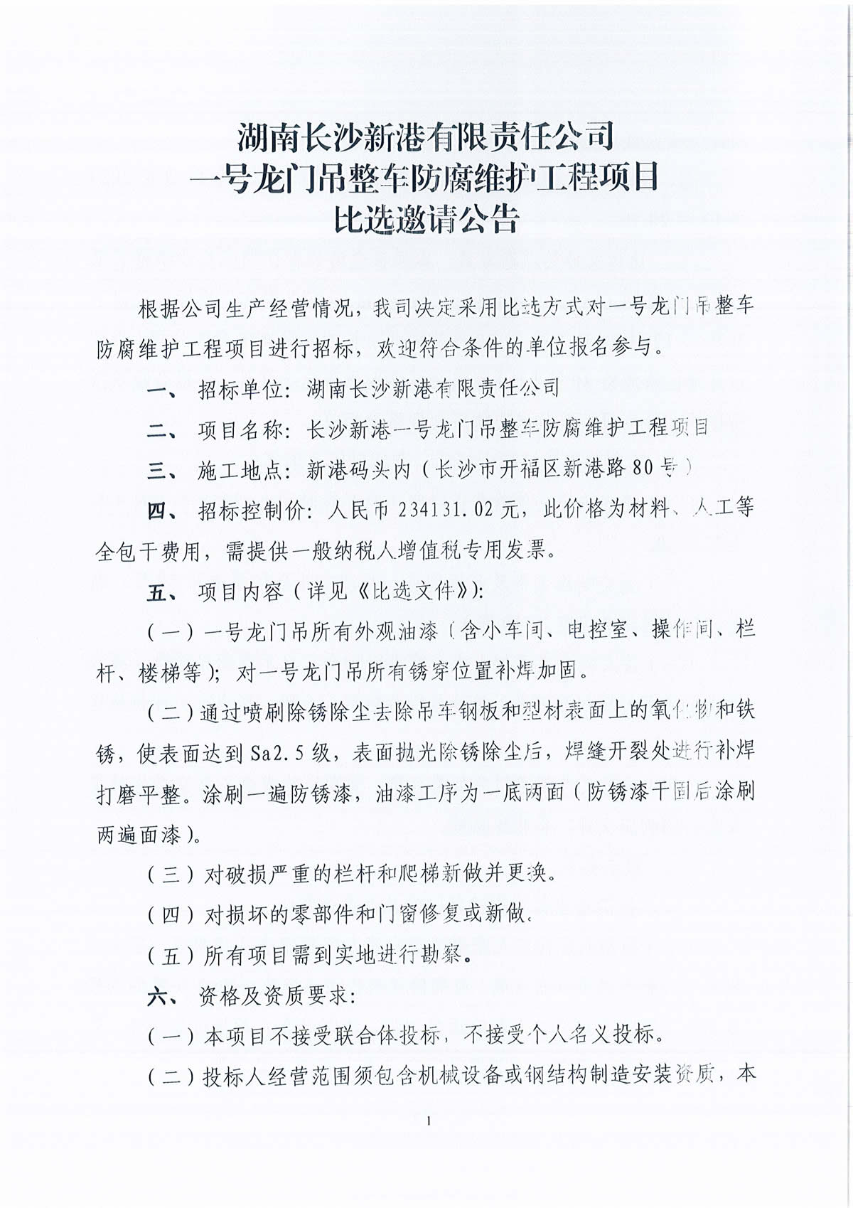 湖南長沙新港有限責任公司一號龍門吊整車防腐維護工程項目比選邀請公告