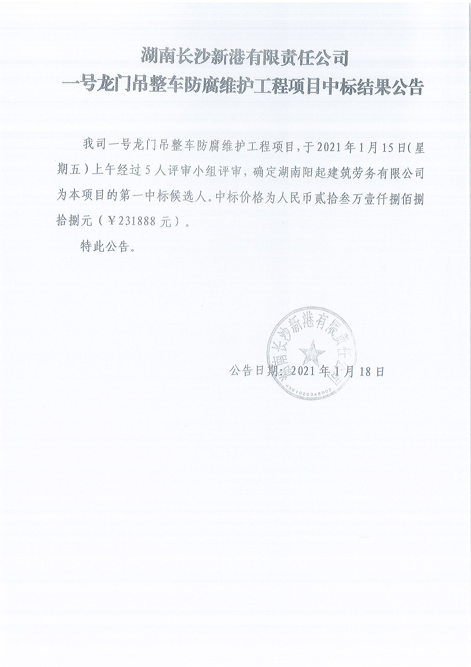 湖南長沙新港有限責(zé)任公司一號龍門吊整車防腐維護工程項目中標結(jié)果公告