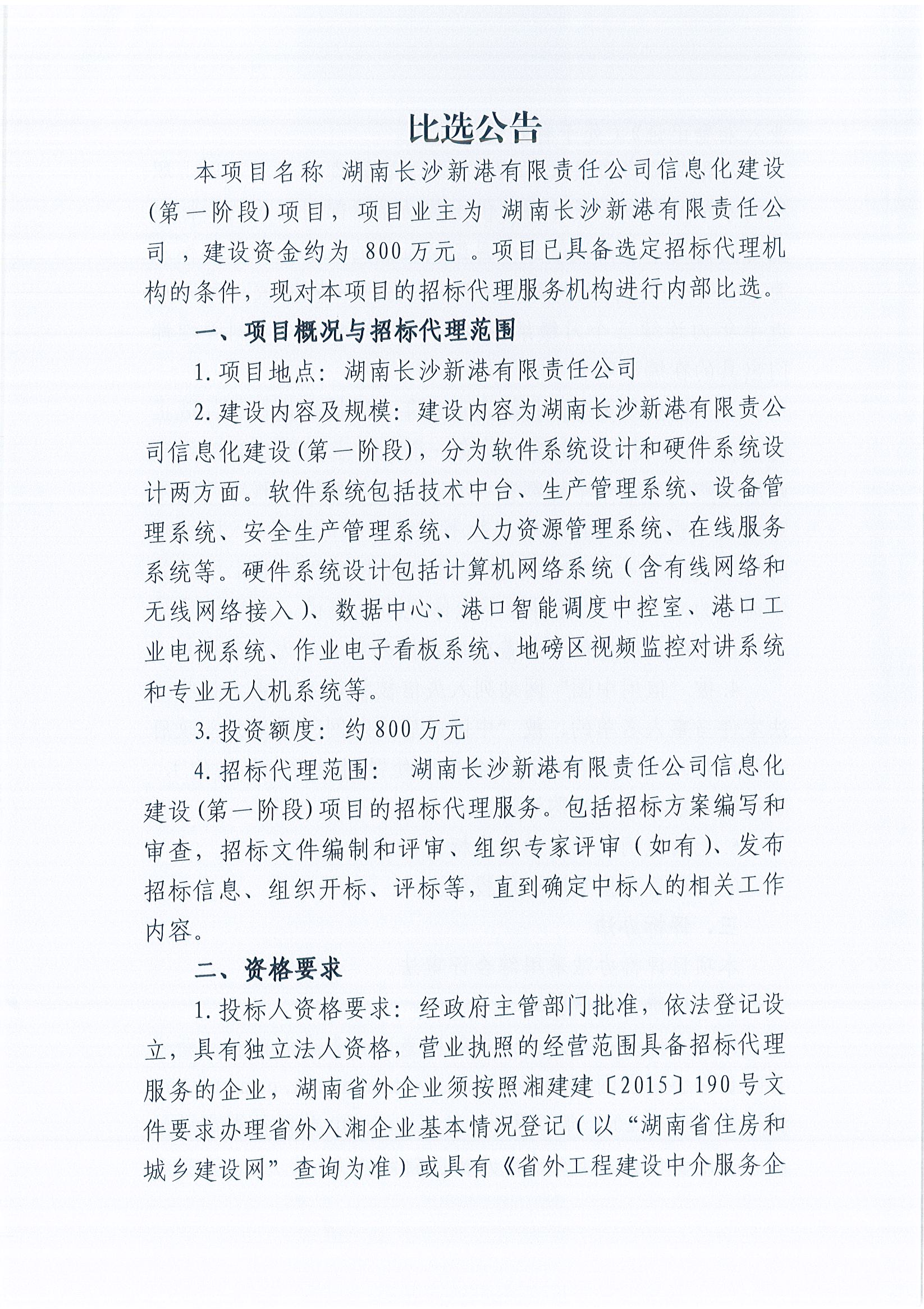 湖南長沙新港有限責(zé)任公司信息化建設(shè)(第一階段)招標(biāo)代理服務(wù)機構(gòu)比選公告