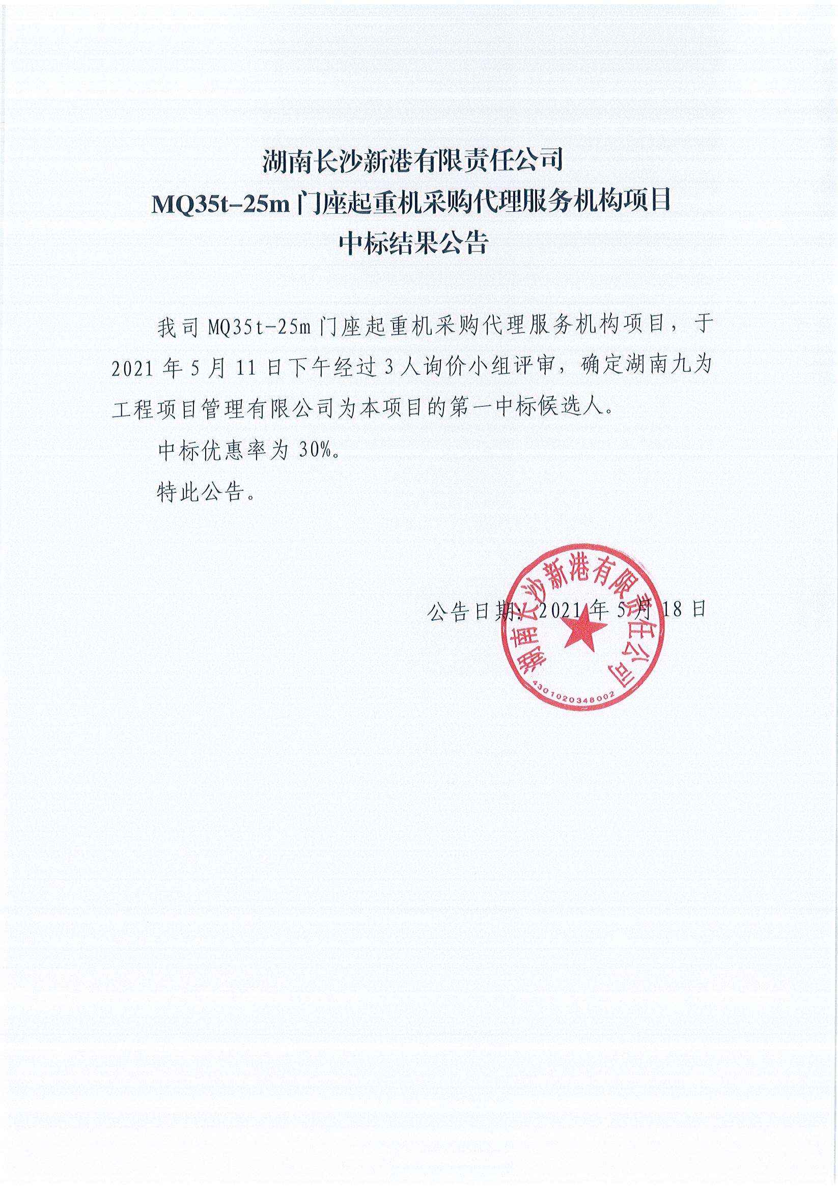 湖南長(zhǎng)沙新港有限責(zé)任公司MQ35t-25m門座起重機(jī)采購(gòu)代理服務(wù)機(jī)構(gòu)項(xiàng)目中標(biāo)結(jié)果公告