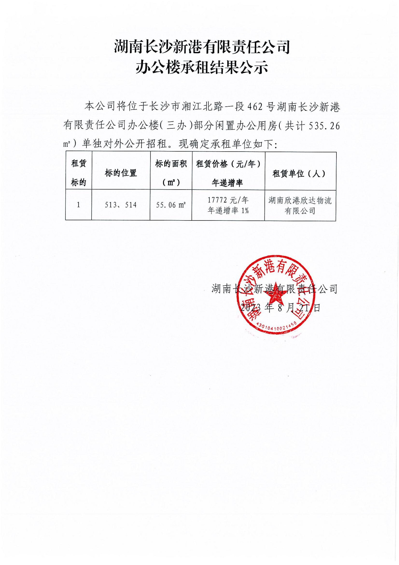 湖南長沙新港有限責(zé)任公司辦公樓承租結(jié)果公示