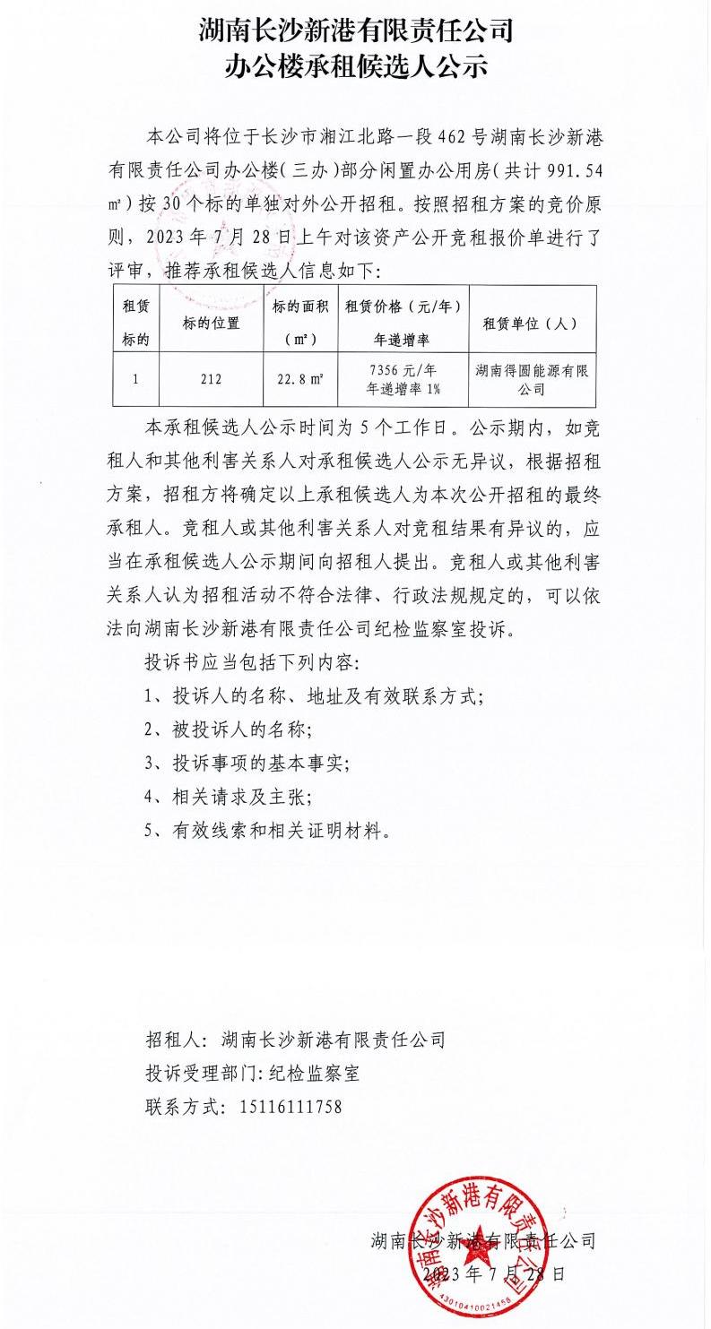 湖南長沙新港有限責任公司辦公樓承租候選人公示
