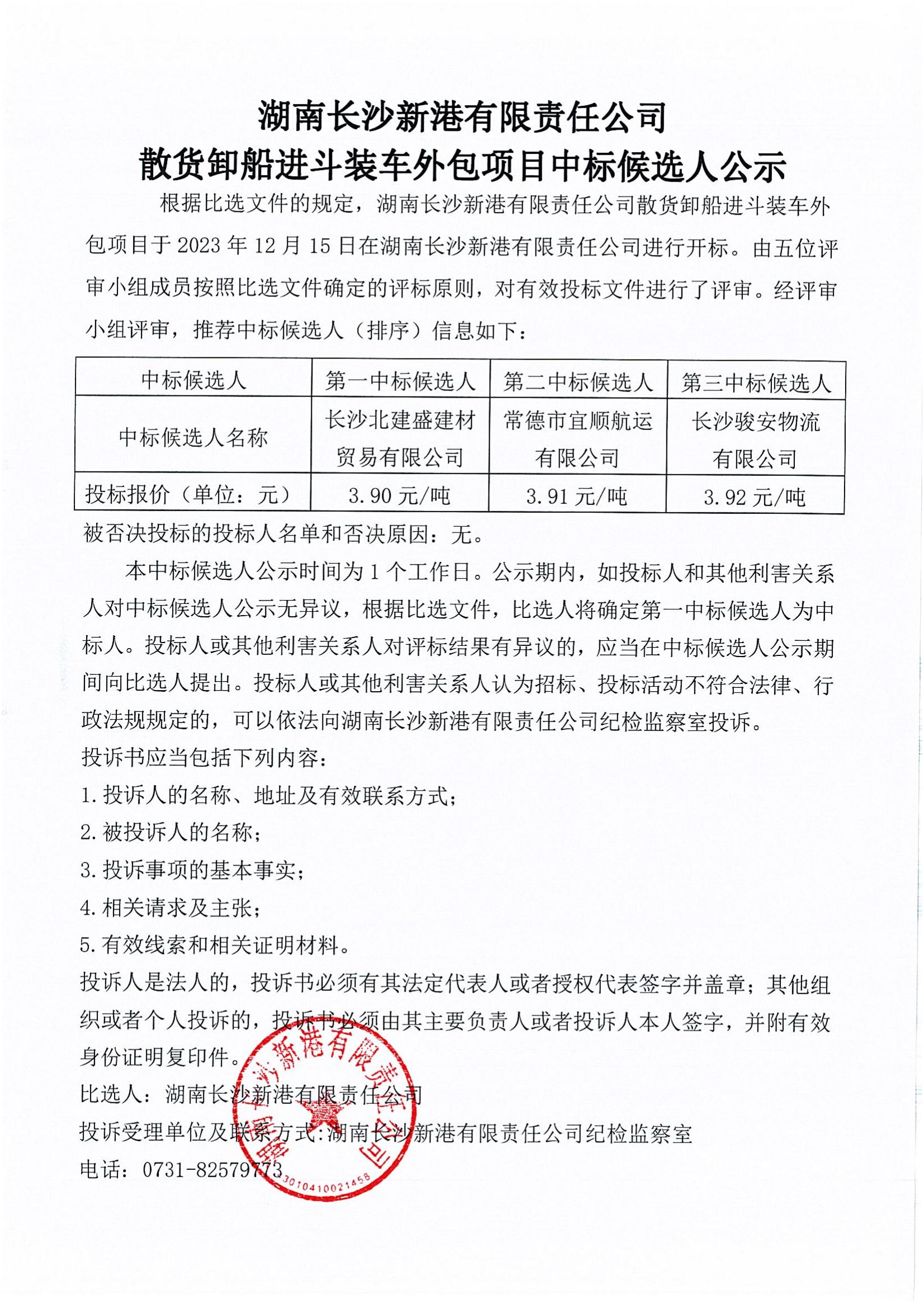 長(zhǎng)沙新港散貨卸船進(jìn)斗裝車外包項(xiàng)目中標(biāo)候選人公示